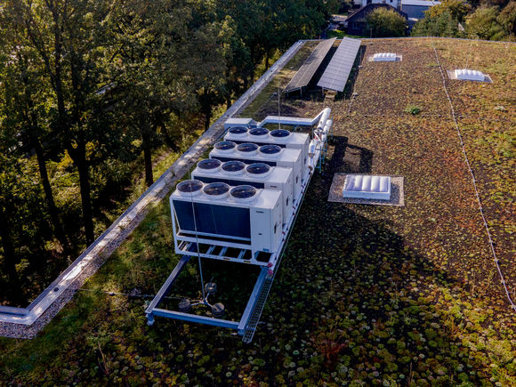 Nagrzewnice są zasilane przez cztery pompy ciepła KaClima AO, usytuowane na dachu retencyjnym. Charakteryzują się one niewielkimi wymiarami, a tym samym możliwością montażu na małej powierzchni. Stosowany czynnik chłodniczy to R32, który spełnia również przyszłościowe wymagania zgodnie z rozporządzeniem w sprawie fluorowanych gazów cieplarnianych i dzięki niskiemu GWP (Global Warming Potential). Pompy ciepła Kampmann zawierają niewielkie ilości czynnika R32, dzięki czemu ekwiwalent CO₂ jest mniejszy nawet o 75 %, przy zachowaniu tej samej wydajności chłodniczej i grzewczej.