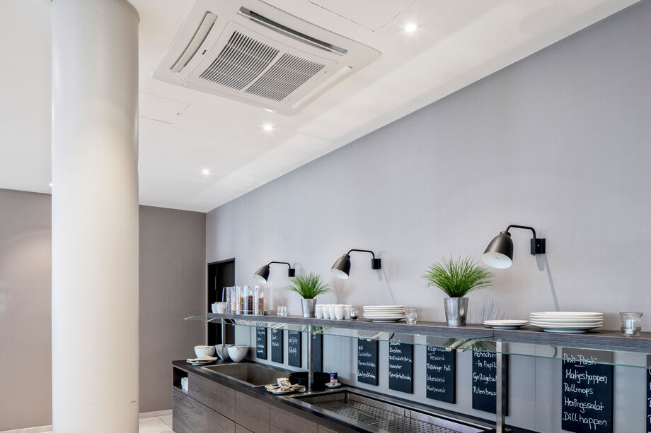 Po przekroczeniu progu hotelu Looken Inn na gościa czeka przestronne i jasne lobby. Jest ono klimatyzowane za pomocą kaset KaCool D, podobnie jak duża sala śniadaniowa i graniczący z nią modny bar. Łącznie w hotelu zamontowano 11 kaset sufitowych, które dostępne są w sześciu wielkościach. Aby zapewnić spójny wygląd, osłony polakierowano na kolor pasujący do danego wnętrza. Kaseta sufitowa KaCool grzeje, chłodzi i daje się bez problemu zintegrować w system automatyki budynku.