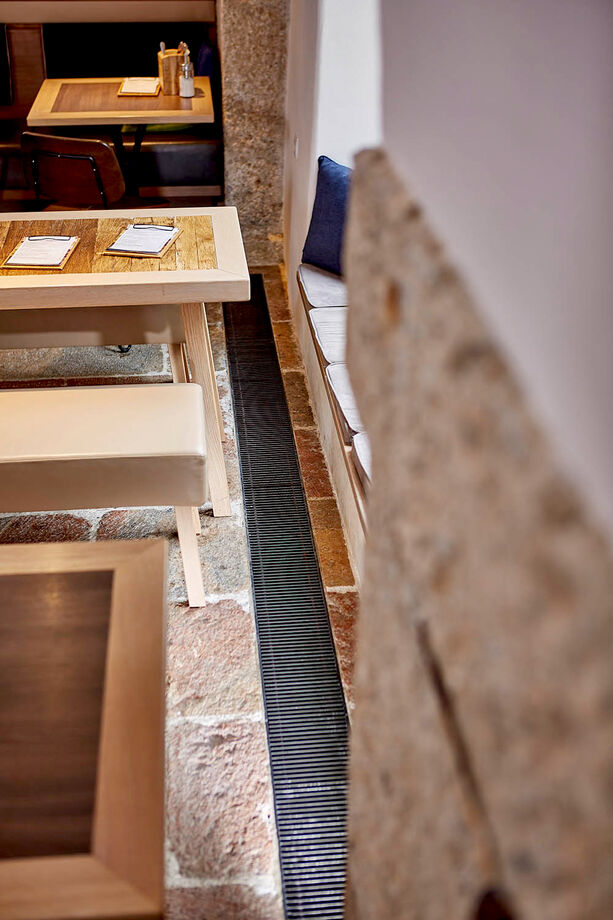 W zamku Hellbrunn konwektory zamontowane przed dużymi oknami w nowej strefie gastronomicznej i pomieszczeniu dla gości zapewniają efektywną ochronę przed zimnym powietrzem. Kratki anodowane na kolor brązu pasują przy tym doskonale do rustykalnego stylu wnętrz.
