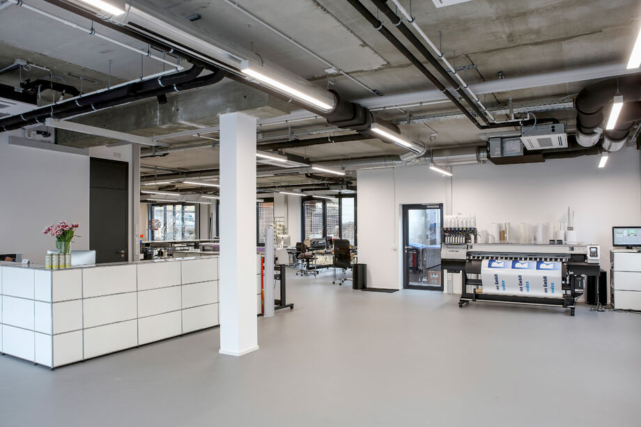 Ale wróćmy jeszcze na chwilę do producenta sprzętu reklamowego: oprócz urządzeń KaDeck w niepodwieszanym suficie znajdują się także kanały wentylacyjne. To, że mogą one naprawdę dobrze wyglądać, udowadniają nawiewniki z rury okrągłej typu RRA firmy Kampmann. Ale oczywiście liczą się przede wszystkim to, co w środku: kierunek strumienia powietrza można indywidualnie regulować – także później, np. gdy zmieni się sposób wykorzystania pomieszczenia. Nawiewniki RRA zapewniają szybką redukcję temperatury i prędkości i są dostępne również w wersji V2A z lakierowaną powłoką wewnętrzną do obszarów wrażliwych.